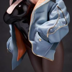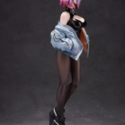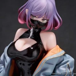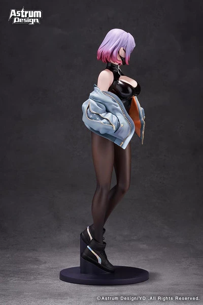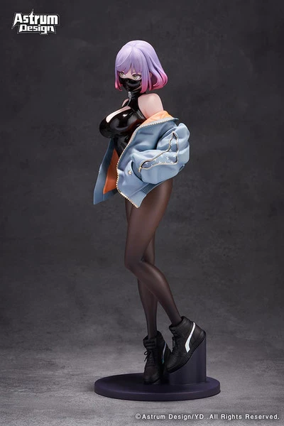 Standing in a cute pose, this masked lady wears a slick black suit and tights as well as a jacket. Luna’s hands remain in her jacket’s pockets as she gives a slight head tilt. Her short purple hair fades to pink and her golden eyes glance in your direction.