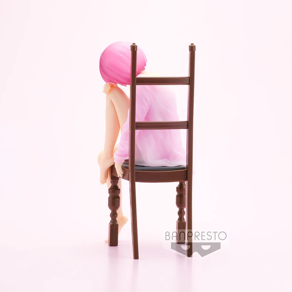Time to relax with Ram. Feeling tired, she sits on a chair with head resting on bent knee. A light pink cardigan that matches her hair hangs off her shoulder and you can see her white slip underneath. Add her to your collection along with the matching Relax Time figure of her sister, Rem!