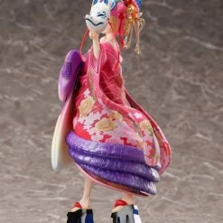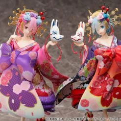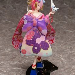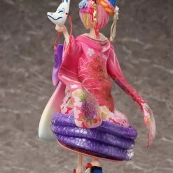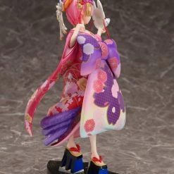 This figure depicts Ram in an incredibly ornate red kimono, emblazoned with a wide variety of beautiful flowers. The violet trim along the back of the kimono add an extra pop to her look. The large purple bow at the front brings more floral accents, and her pink hair is adorned with many flowers and other ornaments.