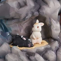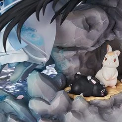 The scene features the two of them relaxing, avoiding mundane worldly affairs. With a gorgeously sculpted landscape comprising of mountain water, flowers and trees, the figure is carefully arranged and painted to create the atmosphere or an ink painting in three-dimensional form. A cave is sculpted behind the rocks, providing a spot for rabbits to live and play, adding to the atmosphere and creating another interesting highlight to look at. Their hair and clothing is sculpted to appear as though flowing in the wind, and translucent parts are used to create the light and thin textures of the sleeves, capturing the pair’s transcendental looks. In the shining moonlight, the inklike look of the black outfit appears to become darker, while the snowlike white outfit, created with pearl paintwork, appears like countless shining stars.