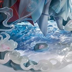 The base of the figure features elegant blue and purple gradation, the water is crystal clear like ice and the rocks look like deep blue jade. The materials that make up the figure have been arranged and sculpted to make it appear as though the rippling pond is illuminated by moonlight, creating a brilliantly shining scene. As fog rises, fragrant orchid petals fall into the pond like rain. If this spring night lasts forever, I won’t even envy the immortal if you stay by my side.