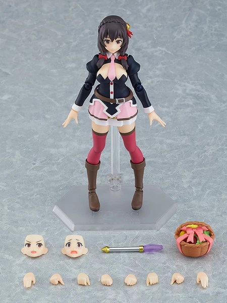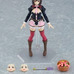 She comes with three face plates including a standard face, a determined face anticipating a battle with Megumin and a crying face! Optional parts include her rod and a gift basket of fruits!