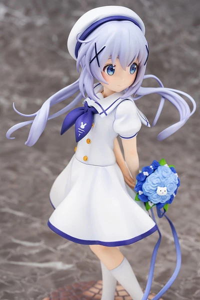 Wearing a beautiful summer uniform, Chino stands in a simple yet elegant pose. She holds a blue bouquet behind her as she twists to look in your direction. Her long silver hair sways with her motion, bringing an extra sense of motion and dynamic scene to this lovely sculpt.