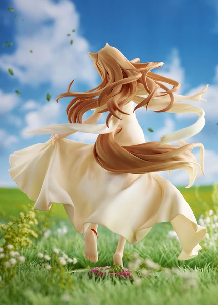 Dancing bare foot atop a bed of green grass and flowers Holo is seen wearing an elegant gown that compliments her fair smooth skin and long ginger hair, ears, and tail.