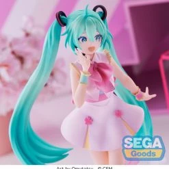Hatsune Miku is seen striking a cute pose for the camera with a big smile and sparkly eyes. Her adorable pink sakura-blossom-inspired dress, with matching shoes and cuffs, has been perfectly recreated in figure form from the illustration by Omutatsu.