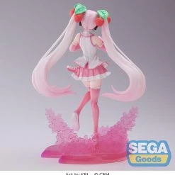 Miku is depicted in a bright pink and white outfit as cherry blossoms float upwards from the base. She is sure to be a perfect addition to any fanโs collection!