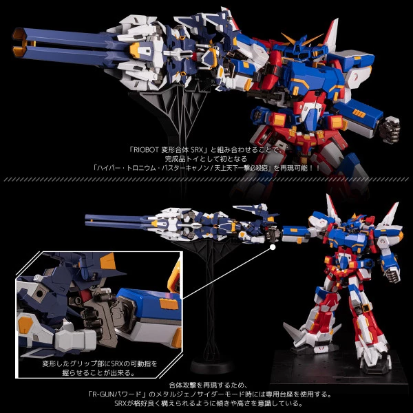 The product comes with Twin Magna Rifle Beam. Katar Sword and Slash Boomerang can also be reproduced. When equipped by the “SRX” (sold separately), you can initiate the combination attack namely “Hyper Tronium Buster Cannon” with “R-GUN Powered”.