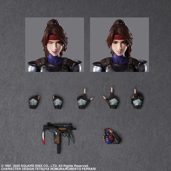 From her metallic armor, to her bandana, and even her waist pouches, no detail from her design in REMAKE was spared. Her face pieces are interchangeable, allowing you to pose her while sheโs smiling or winking.
