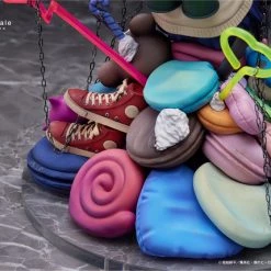 The bloodthirsty villain is sitting atop a pile of assorted things she finds cute, like plushes, sweets and knives.