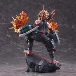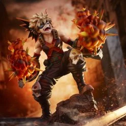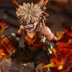 Seen standing in a dynamic pose atop a themed base, Bakugo activates his quirk, releasing explosions from the palms of his hands.