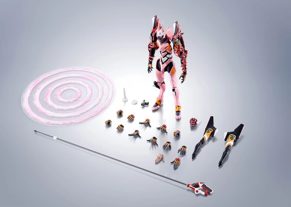 Set Contents: Main Body, Three pairs of optional hands, Two pairs of optional forearms, Optional arms, Optional head, Weapon, New Unit-02α optional right hand, Effect part, Effect part joint set, Tamashii STAGE joint.