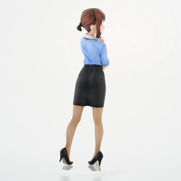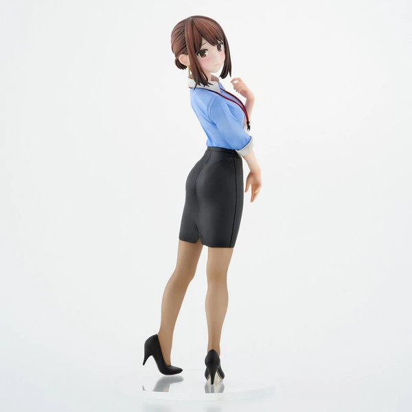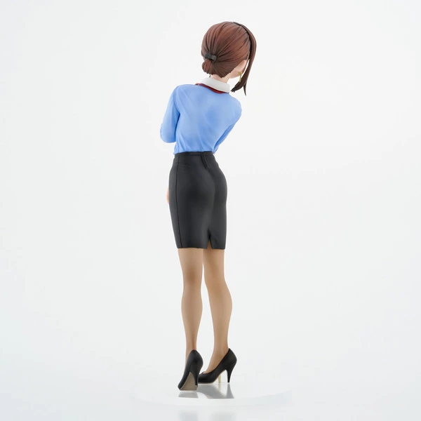 Peering over her shoulder she blushes in embarrassment as she catches you checking her out. Her blue blouse and tight black skirt show her womanly curves while her brown hair is pulled beautifully back into a bun.