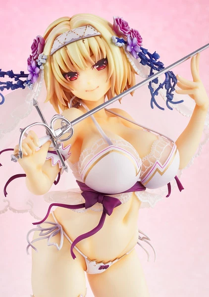 She is seen holding her rapier sword as she gives a menacing grin as an unseen breeze brings motion to the strings and veil of her outfit.