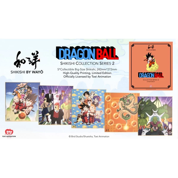 Wayô presents a brand new collection of Dragon Ball Shishiki! Authentic Japanese big-size Shikishi* (242mm*272mm), inserted in a beautiful hard-cover collector box. Contains 5 Shikishi with 5 original illustrations from the Dragon Ball Series, limited to 1000 and officially licensed by Toei Animation!